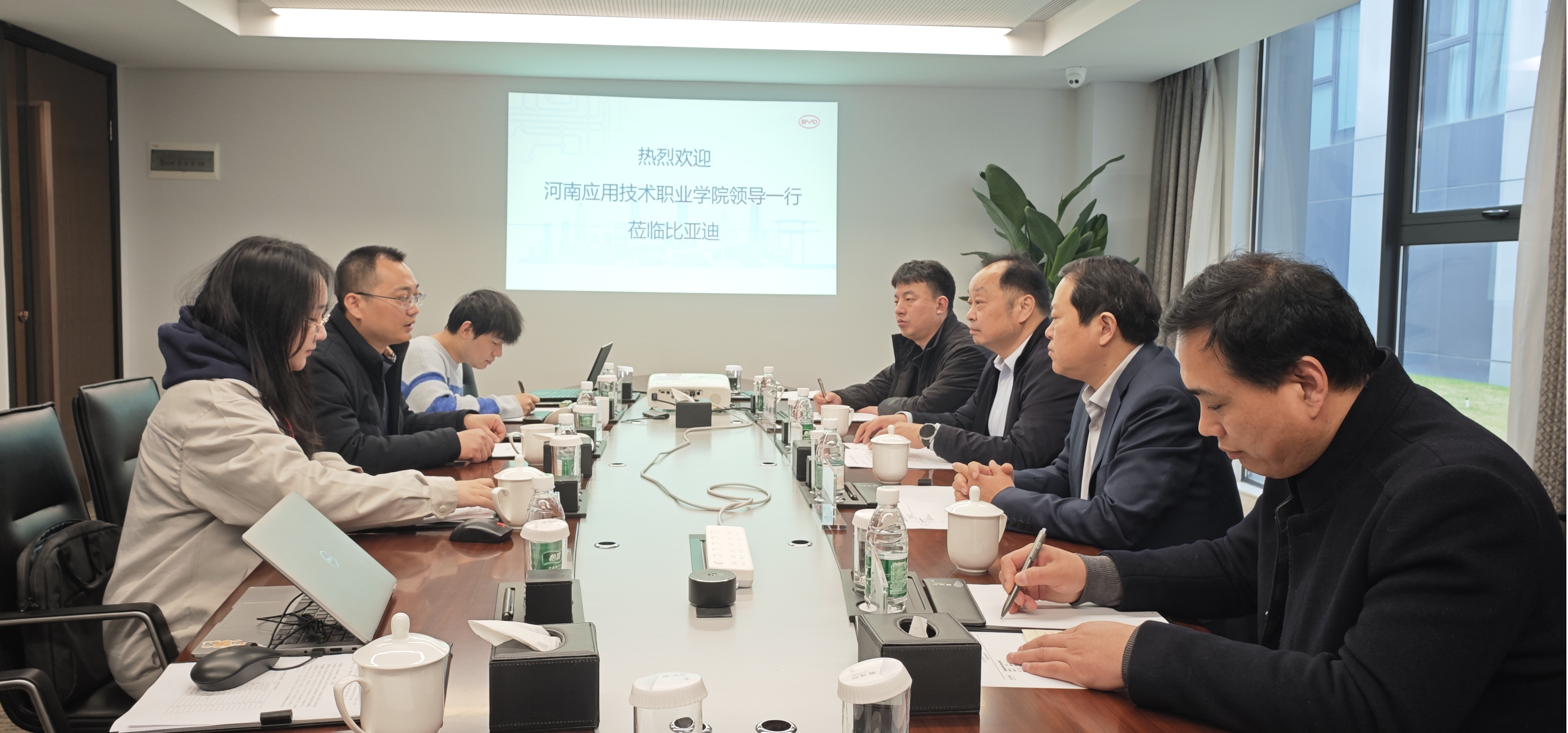 3月7日,校长薄新党,副校长常新中,院长办公室及beat365亚洲版官网负责人一行4人赴深圳比亚迪股份有限公司调研交流。比亚迪股份有限公司人力资源处校企合作经理杨双喜及相关业务负责人热情接待并出席座谈会。