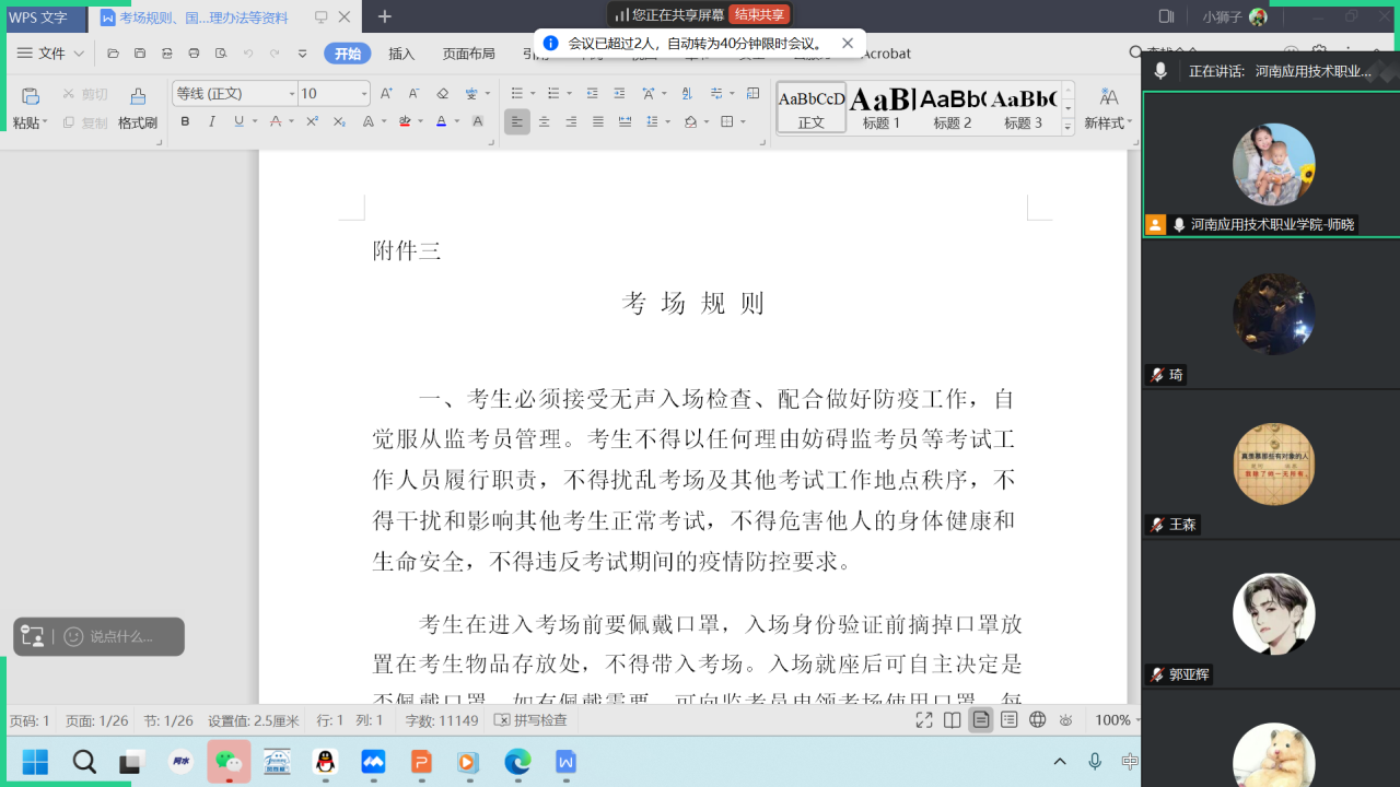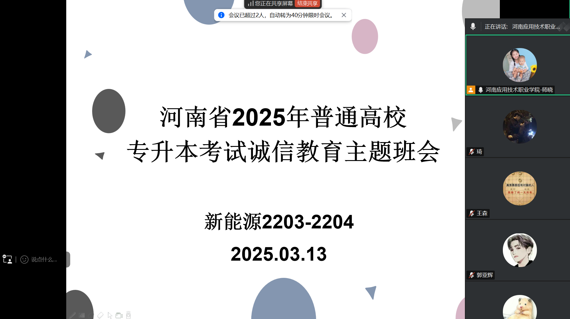 为深入贯彻落实国家教育考试相关规定,强化专升本考生诚信意识,保障考试公平公正,beat365亚洲版官网于3月13组织全体专升本考生召开“诚信应考·笃行致远”主题班会。考虑到专升本考生正处于紧张备考状态,本次班会决定采取线上形式开展。会议围绕考试纪律、物品准备及“无声入场”规范展开全方位指导,全体考生在线参会,确保考前准备“零疏漏”、诚信教育“全覆盖”。