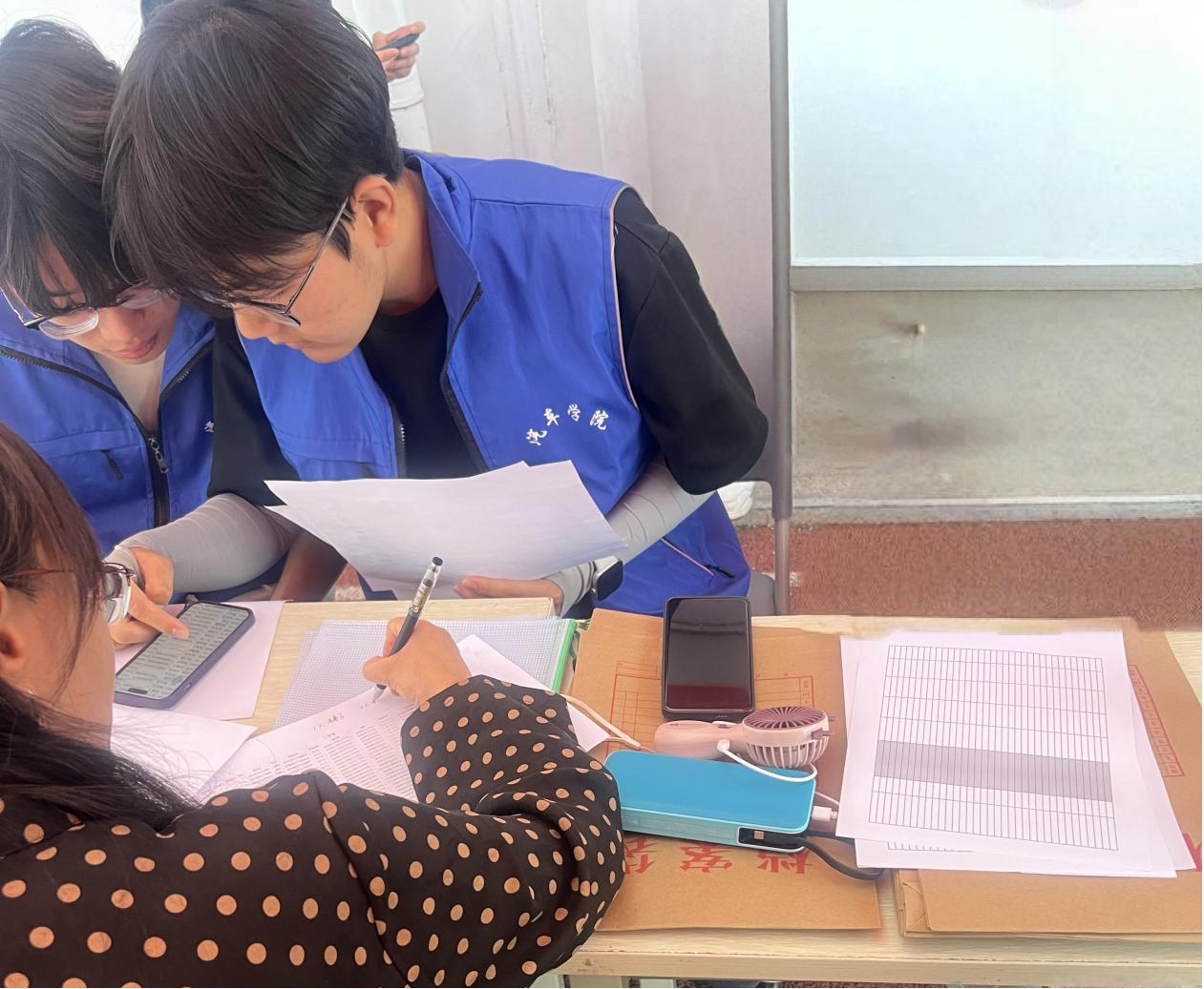 志愿服务点准备就绪,考生抵达后,志愿者引导其完成报道与信息确认,仔细核对信息表和身份证、准考证等证件,确保信息准确、证件有效。同时,志愿者精心制作 “考前路线图”,详细标注校门到考场路线,并耐心讲解发放。完成信息确认后,志愿者还带领考生沿考试路线熟悉考场,介绍沿途标识和考场座位、设备等情况,助考生缓解紧张情绪。最后,志愿者们对当天未到达确认的考生逐一电话确认情况,详细询问未到场原因,并提醒考试相关注意事项,确保每一位考生都能顺利参加考试。